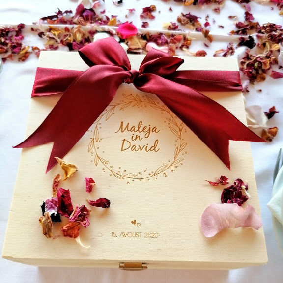 Darilo za poroko - lesen zabojček z graviranima kozarecma in penina.