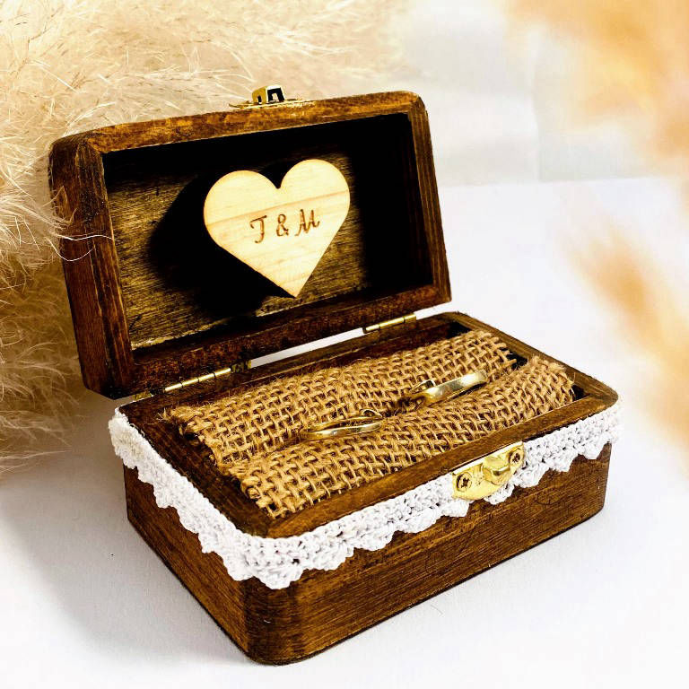 Škatlica z ročno izdelano čipko, srčkom z vgraviranima inicialkama in juto.