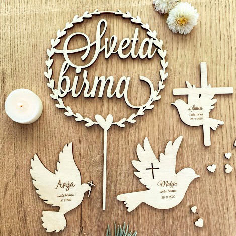 Stoječ lesen srček Sveta birma in golob z imenom, višina cca 15cm.